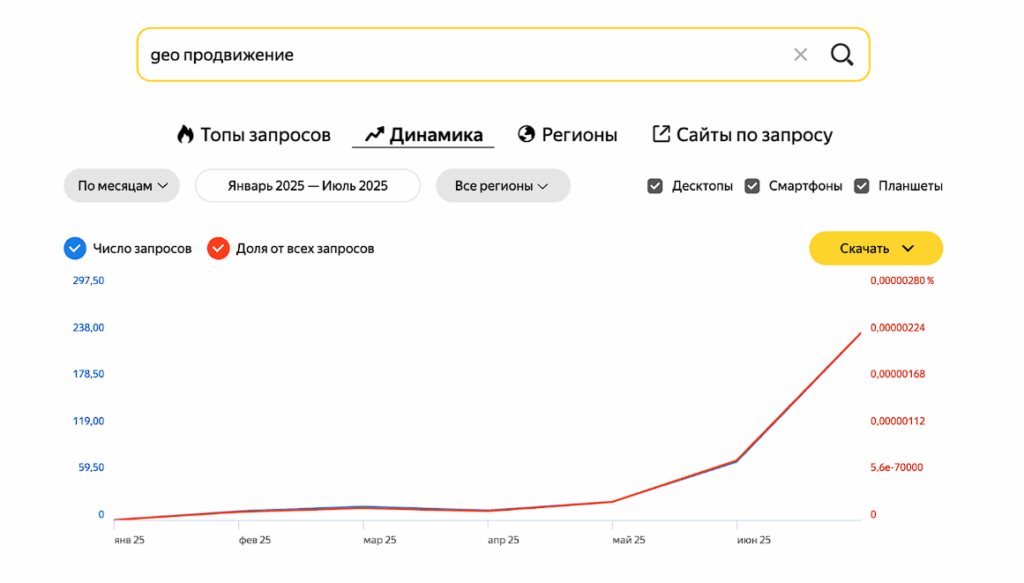 Спрос на GEO-продвижение с мая 2025 активно растет и все больше компаний обращаются за услугой, чтобы успеть занять первое место в выдаче AI.