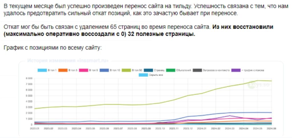 SEO-кейс: продвижение сервиса для страховых агентов с сайтом на Тильде Реферальный сервис по работе со страховыми агентами: цель - максимальное привлечение страховых агентов для работы с платформой Заказать бесплатный аудит сайта Дата сотрудничества: 12 декабря, 2022 https://inssmart.ru/ Maximus Media Кейсы InsSmart С чем пришел клиент Клиент обратился к нам задачей расширения и продвижения одностраничного сайта на платформе Тильда SEO для финансовых услуг: кейс по продвижению сервиса страхования на платформе Тильда Сервис, быстро завоевавший доверие пользователей и уверенно набирающий обороты, кажется, имеет все для успеха. Однако для устойчивого роста в интернете нужна стратегия, которая поможет не только масштабироваться, но и закрепить позиции на рынке. Наш клиент прекрасно понимал важность грамотного маркетинга и уделял внимание каждой его детали. Поэтому, решив найти высококвалифицированного подрядчика для SEO-продвижения, он обратился в наше агентство. Подрядчика выбирали тщательно: мы прошли тестовое задание и несколько интервью, прежде чем приступили к работе над сайтом. Можно ли продвинуть сайт без создания новых страниц? Как можно охватить большое количество страховых агентов? Показатель отказов в 3% при трафике более 120.000 посетителей — это реально? Потеряли 50 страниц при переносе сайта на Тильду… Но, увеличили трафик на 10% Рост трафика х2 и 2000 запросов в топ-10 Чтобы эффективно развиваться и занимать устойчивые позиции, важно точно понимать свое позиционирование и цели. Клиент проработал эти моменты, поставил перед нами конкретные задачи и заполнил объемный документ с данными о своей компании и целевой аудитории. Помните: хорошо заполненный бриф — основа эффективной работы, нацеленной на результат! Итак, наша цель ясна — поднять сайт в топ поисковой выдачи по интересующим клиента запросам. Приступаем к работам. Первым делом мы проанализировали нишу, сайт клиента, провели технический аудит и устранили ошибки. (Останавливаться подробнее на этом моменте не будем, но если вам интересно — дайте знать в комментариях, и мы напишем чек-лист, как владельцу бизнеса базово проверить свой сайт или своего подрядчика). Далее собрали семантику и разработали два шаблона для новых страниц сайта: Шаблон коммерческой страницы Шаблон страницы статей А можно ли продвинуть сайт без создания новых страниц? Часто к нам приходят компании с сайтами из нескольких страниц и интересуются перспективами SEO-продвижения. Мы, конечно, могли бы взять их сайт в работу и, не принеся обещанного результата, через несколько месяцев “слиться” с проекта. Но нас интересует долгосрочное сотрудничество и развитие наших клиентов, поэтому мы объясняем нюансы работы и важность создания новых страниц. Мы разрабатываем SEO-структуру и распределяем технические и SEO-работы так, чтобы процесс продвижения был удобным и эффективным. Все наши предложения и тарифы — индивидуальны, разработаны исключительно под задачи клиентов. Собрав семантику, мы заметили, что из-за специфики ниши коммерческие ключи имеют низкую частотность. Поэтому в дальнейшем мы уделяли особое внимание информационным запросам, делая на них ставку в первую очередь и параллельно прорабатывая коммерческие страницы. И действительно — первыми “стрельнули” информационные страницы: в первые месяцы ⅕ конверсий 