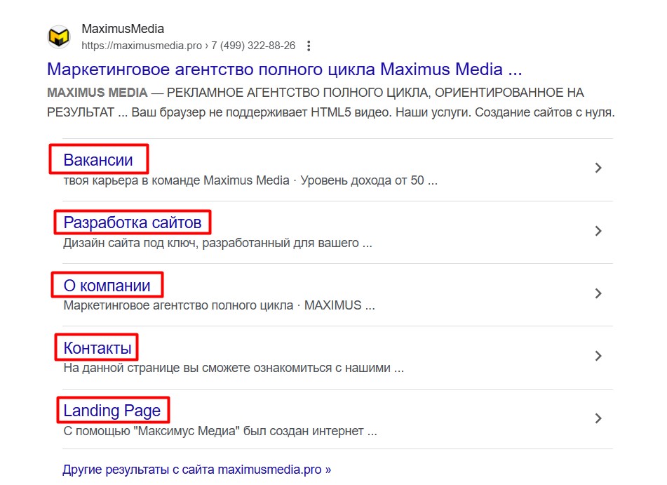 В поисковой системе (чаще всего в Google или Яндекс) быстрые ссылки появляются под основной ссылкой на сайт и могут выглядеть, например, так: